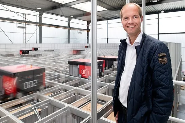 Jörg Venker, Leiter Corporate Logistics bei Tece, beaufsichtigt die Weiterentwicklung des Distributionszentrums in Emsdetten. Im Hintergrund: Kommissionier-Roboter bei der Arbeit. – © Tece