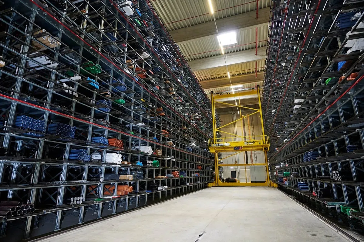 38.000 m² ist der Gebäudekomplex groß, der aus mehreren Lagerbereichen besteht. Herzstück ist das automatische Kleinteilelager: Zwei Drittel der Gesamtartikel lagern hier an den 114.000 Behälterplätzen – vom Dichtungsring bis zur Armatur. Ob Einlagerung oder Kommissionierung: Die weitestgehend automatisierten Abläufe sorgen für eine sichere Auftragsabwicklung und kurze Reaktionszeiten. 25 systemgesteuerte Shuttles bewegen sich über die Förderstrecken in fünf Gassen auf jeweils 38 Ebenen, bringen und holen die Waren vom und zum Lagerplatz. Ob Warenein- oder -ausgang: Die Mitarbeiter an den 16 multifunktionalen Arbeitsplätzen haben digitale Zugriffsmöglichkeiten und kommunizieren mit der Anlage per Touchscreen. Moderne Lagertechnik und SAP-gestützte IT-Infrastruktur sorgen für hocheffiziente Abläufe. So auch im Langgutlager: Was länger als 1,50 m ist, findet hier seinen richtigen Platz – momentan rund 600 Artikel, davon primär Rohre. In Kassetten wird die Ware aufbewahrt, jede davon ist 6,70 m lang und kann mit bis zu 3 t belastet werden. Technische Unterstützung ist auch in diesem Wabenlager nicht weit: „Wenn sich das zentrale Warenbediengerät in Bewegung setzt, ist technische Präzision im Einsatz“, freut sich Buck.
