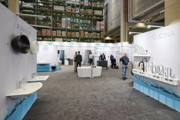 Auf einer Gesamtfläche von 300 m2 wurde die Eigenmarkenmesse eingerichtet – direkt am Stammsitz des SHK-Großhändlers in Böblingen. Einiges an Logistikfläche wurde dafür geopfert und Teile vom Gesamtlager freigeräumt. Statt klassische Hochregale dort aufzustellen, wurde ein eigenes Flächenkonzept gestaltet. „Hier gewähren wir interessante Einblicke in die Welt der diversen Reisser-Eigenmarken“, erklärt Tom Breitsprecher, Leiter Produktmanagement Sanitär. Dass der Großhändler weit mehr ausmacht als die unverwechselbare Designbad-Ausstellung und das hochmoderne Logistik- und Lagerzentrum, das will das Unternehmen damit unterstreichen. „Wir wollen zeigen, was es für coole Sachen in der Eigenmarke gibt.“