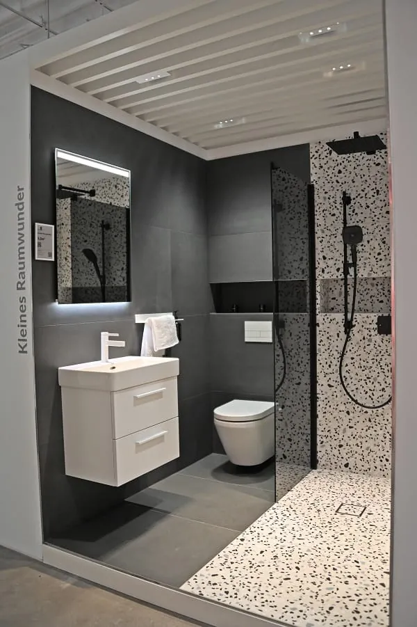 Wie eine Stadt ist die neue Ausstellung aufgebaut: Am Rand finden sich 23 Kojen, jede trägt ihren eigenen Namen und soll so auch eine Geschichte transportieren. Bei der „Hüttengaudi“ ist es urig und das Bad ist mit viel Holz gestaltet, wohingegen sich „Wie damals“ mehr in Richtung Vintage zeigt. Eine pinke Wand, luxuriöser Marmor und viel Platz für Beautyprodukte gibt es in der „Aufhübschzone“, das Familienbad präsentiert sogar eine Kinderbrause. „Jedes Bad hat eine Story und wir haben den Raum dazu gestaltet“, sagt Frühwald. Drei weitere Ausstellungsboxen hat der Exklusivlieferant Talsee ausgestattet.