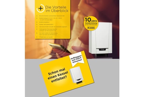 Remeha versandt an 18.000 Heizungsbauer in Deutschland einen Brief zur Verkaufsaktion. Darin ein Poster, auf dem alle wichtigen Informationen stehen. Zusammengefaltet passt es exakt in einen schlanken Briefumschlag, entfaltet ist das Poster genauso groß wie ein Tzerra-Kessel: 36,8 x 54,1 cm.