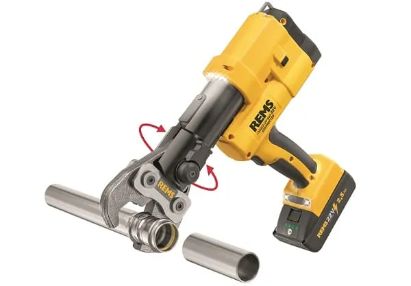 Die smarte Akku-Radialpresse von Rems hat eine Schubkraft von 32 kN und ist geeignet für Radial-Pressverbindungen von 10 bis 108 mm Durchmesser. Angetrieben werden können Rems-Presszangen/-Pressringe und geeignete Presszangen/Pressringe anderer Fabrikate. Mit einem Gewicht von nur 3,3 kg und einer Länge inklusive Presszange V15 von nur 36,3 cm ist sie angenehm leicht und handlich. Eine optimale Gewichtsverteilung, ergonomische Bauweise, Griffflächen mit Softgrip und Anti-Vibrations-System garantieren dem Anwender ein angenehmes Arbeiten. Weitere praktische Features sind die drehbare Presszangenaufnahme, die elektrische Überwachung des Zangehaltebolzens, der Sicherheits-Tippschalter und einstellbare LED-Arbeitsleuchten.