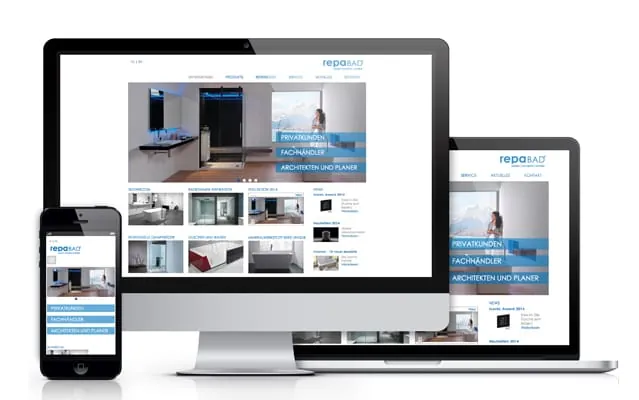 Die neue Seitenstruktur und Menüführung bieten dem Besucher der Repabad-Seite eine schnelle Orientierung. Die Gliederung in unterschiedliche Nutzergruppen – Privatkunde, Fachhandwerk und Architekten / Planer – macht spezifische Inhalte auf einen Klick sichtbar. Die Startseite zeigt Messetermine, Produktneuheiten sowie aktuelle Nachrichten.