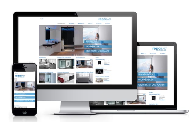 Die neue Seitenstruktur und Menüführung bieten dem Besucher der Repabad-Seite eine schnelle Orientierung. Die Gliederung in unterschiedliche Nutzergruppen – Privatkunde, Fachhandwerk und Architekten / Planer – macht spezifische Inhalte auf einen Klick sichtbar. Die Startseite zeigt Messetermine, Produktneuheiten sowie aktuelle Nachrichten.