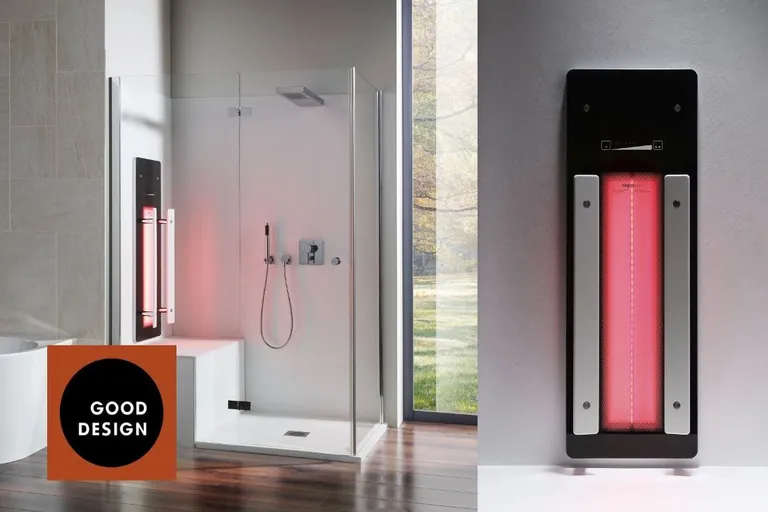 „Bilbao“, das kompakte, frei in der Dusche zu positionierende Paneel von Repabad, passt laut Unternehmensangaben in jede Dusche und macht aus dieser eine Infrarotkabine. Das Infrarotelement besteht aus einem Paneelrahmen in Aluoptik und einem Glasaufsatz mit integrierter Infrarotwärmequelle. Das Glas ist wahlweise in den Farben „Coffee“, „Dark Black“, „Obscure“, „Pearl“ und „Snow“ oder in Sonderfarben lieferbar.