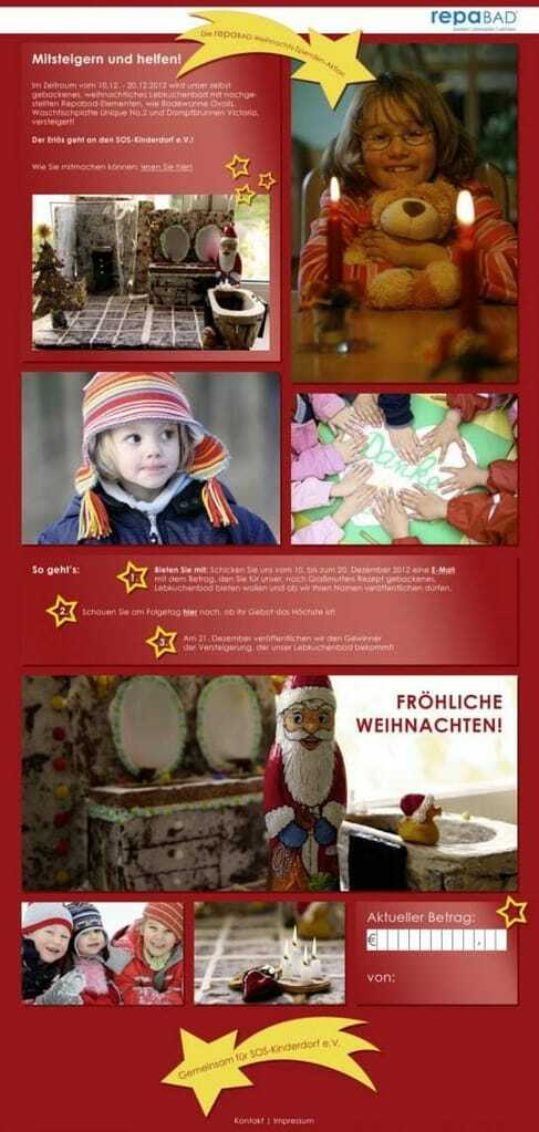 Ein Badezimmer aus Lebkuchen versteigert Repabad zu Gunsten des Vereins SOS-Kinderdorf.   Vom 10. bis 20. Dezember wird das Back-Kunstwerk versteigert. Die Gebote können an die E-Mail-Adresse info(a)repabad.com geschickt werden. Auf der Internetseite www.repabad.com wird täglich das aktuell höchste Gebot veröffentlicht. Am Freitag, 21. Dezember erfolgt die Bekanntgabe. So wird das Repabad-Lebkuchen-Badezimmer rechtzeitig zum Weihnachtsfest verschickt. Der Erlös aus dieser Weihnachtsaktion geht an SOS-Kinderdorf e.V.