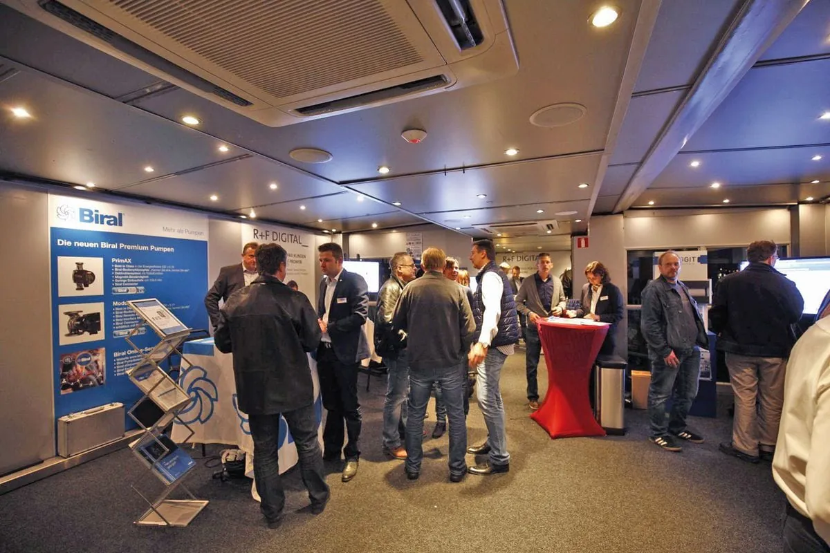 Am 23. November fand sie in Aschaffenburg ihren Abschluss. Ein breites Angebot war zu sehen: 18 Partnerfirmen begleiteten den R+F Truck auf seiner Rundreise. Auf zwei Ebenen präsentierten die Aussteller ihr Sortiment aus den Bereichen Sanitär, Heizung, Installation und Lüftung und boten sich mit den Besuchern einen regen Informationsaustausch. Richter+Frenzel selbst war mit R+F DIGITAL im Obergeschoss des Jubiläumsmobils stationiert. Am Stand konnten die Kunden alle digitalen Angebote, die R+F derzeit für Tablets und Smartphones bereithält, direkt austesten. Das Interesse daran war groß. Besonders die neue VR-Brille realityPro, mit der Endkunden ihr neues Bad schon vor dem Baubeginn in der „Virtual Reality“ betrachten und im Panorama-Modus über 360 Grad begutachten können, erwies sich bei den Fachbesuchern als Highlight.