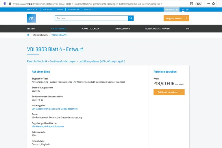 Herausgeber der Richtlinie VDI 3803 Blatt 4 Entwurf „Raumlufttechnik – Geräteanforderungen; Luftfiltersysteme (VDI-Lüftungsregeln)“ ist die VDI-Gesellschaft Bauen und Gebäudetechnik. Die Richtlinie ist im September 2021 als Entwurf erschienen. Sie kann zum Preis von EUR 218,90 beim Beuth Verlag (Tel.: +49 30 2601-2260) bestellt werden. Onlinebestellungen sind unter www.vdi.de/3803 Blatt 4 oder www.beuth.de möglich.
