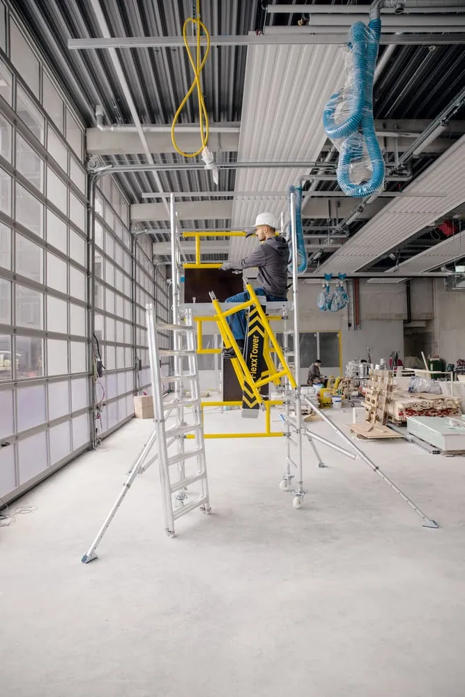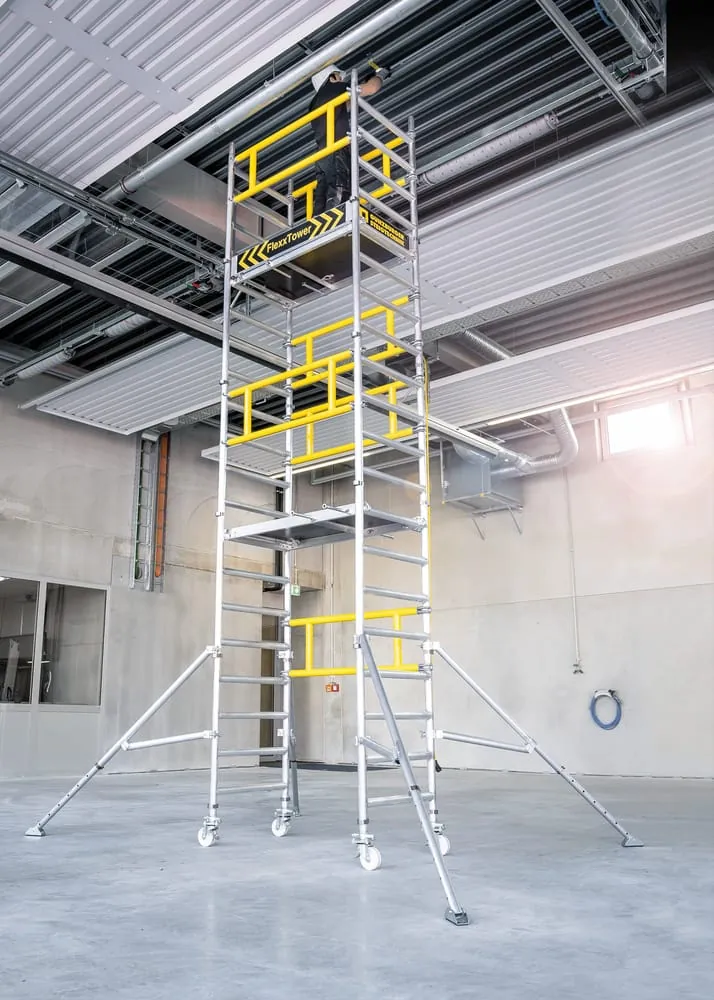 Der FlexxTower hat eine Plattformhöhe von 4,10 Meter, sodass damit Arbeitshöhen bis zu rund 6,10 Meter erreicht werden. Bei niedriger gelegenen Arbeitsplätzen lässt sich das Gerüst auch flexibel in geringeren Aufbauhöhen montieren. Dabei erfüllt es alle geltenden Vorschriften und ist mit der DIN EN 1004 konform. Aufbauen lässt sich der FlexxTower einfach und schnell von einer Person. Die handlichen und leichten Einzelbauteile aus Aluminium werden an ausziehbaren Einhängekonsolen der Plattform (1,20 x 0,60 Meter) eingehängt und so unkompliziert von Ebene zu Ebene mitgenommen. Schnellverschlüsse und Gerüstklauen ermöglichen den effizienten Aufbau ohne Werkzeug, so die Unternehmensangaben.