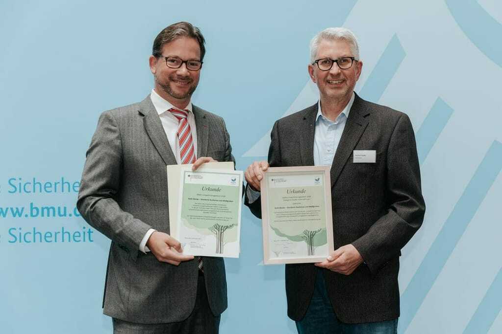 Der Parlamentarische Staatssekretär im Bundesumweltministerium Florian Pronold (links) übergab die Urkunde zur Ehrung besonders nachhaltigkeitsorientierter Unternehmen an Hartmut Gojdka, Umweltmanagementbeauftragter bei Roth Werke. – © BMU/Sascha Hilgers