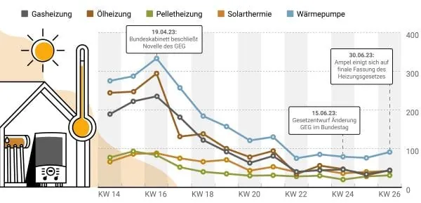 In der DAA-Grafik ist ein Wendepunkt ablesbar, nachdem der GEG-Entwurf im April 2023 im Bundeskabinett beschlossen wurde. Ab diesem Zeitpunkt sank bei DAA-Portalen die zuvor ungewöhnlich hohe Nachfrage nach fossil betriebenen Heizungssystemen. Ab der Kalenderwoche 18 überstieg das Interesse an regenerativ betriebenen Heizungssystemen wieder das an fossil betriebenen. Diese Situation hielt das gesamte restliche2. Quartal an.