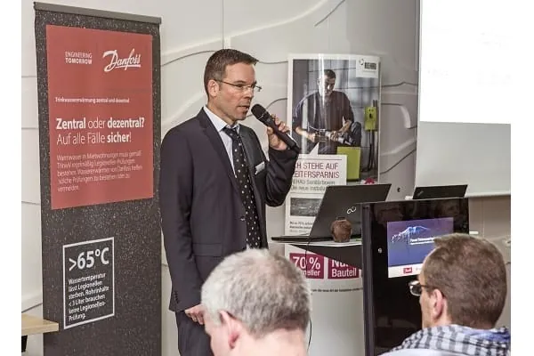 Aufbauend darauf stellte Stefan Lütje, Application Manager bei Danfoss, zentrale Speicherladesystemen und dezentralen Wohnungsstationen gegenüber und Olaf Kruse, Projektmanager bei Rehau, referierte über den Transport von Warm- und Kaltwasser zur Entnahmearmatur.