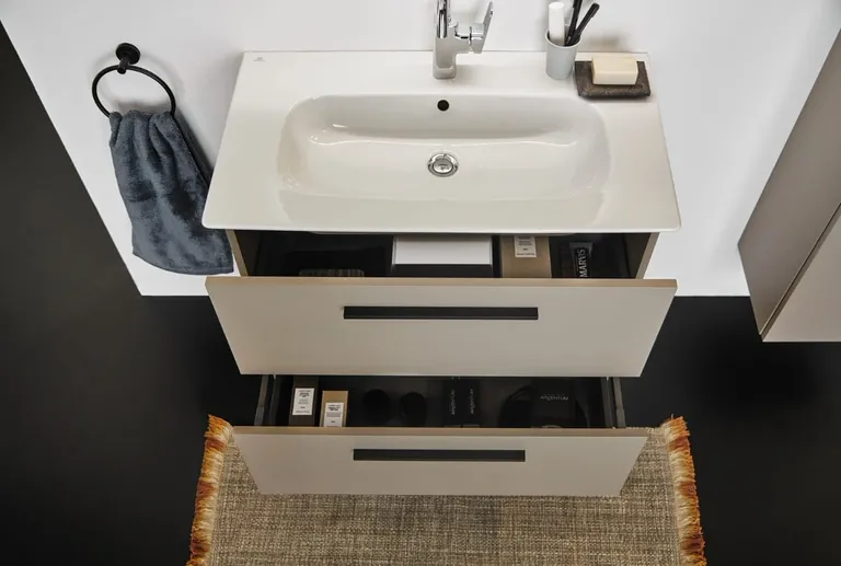 i.life S eignet sich durch die reduzierte Ausladung bei Waschtischen und WCs hervorragend für kleinere Räume wie Gästebäder oder Badezimmer in kleinen Wohnungen. Ihre schlanken Soft-Edge-Formen verleihen der Keramik eine leichte und elegante Optik. Die Möbel dieser Linie bieten zusätzlichen Stauraum und sind ebenfalls in sieben Oberflächen erhältlich.