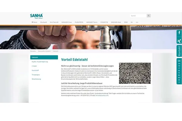 Den Produktserien räumt Sanha nun einen prominenten Platz ein. Mit wenigen Klicks erhält der Nutzer zu jedem System die relevanten Daten – von den Betriebsbedingungen über Zertifikate bis zu Referenzen. Dazu passt die klare Betonung des News-Streams: Neuigkeiten zu Produkten, aus dem Unternehmen oder aus der Branche lassen sich schneller und fokussierter wahrnehmen.