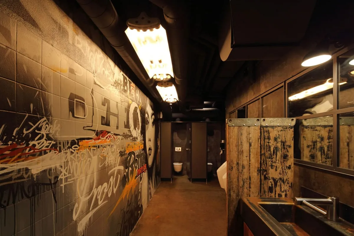 Für den Sanitärbereich war die Umgestaltung mit einem Umzug ins Untergeschoss verbunden. Dort erleben die Gäste heute Graffiti-Wandgestaltungen sowie Wände und Böden in dunkler Beton-Optik. Davor haben Sanitärprodukte von Geberit – die Urinale Preda sowie Keramag iCon WCs – ihren Auftritt. Das strahlende Weiß der Keramik hebt sich von den dunklen Wänden ab. Ihre modern-zeitlose Form passt zum industriellen Stil der Räume.