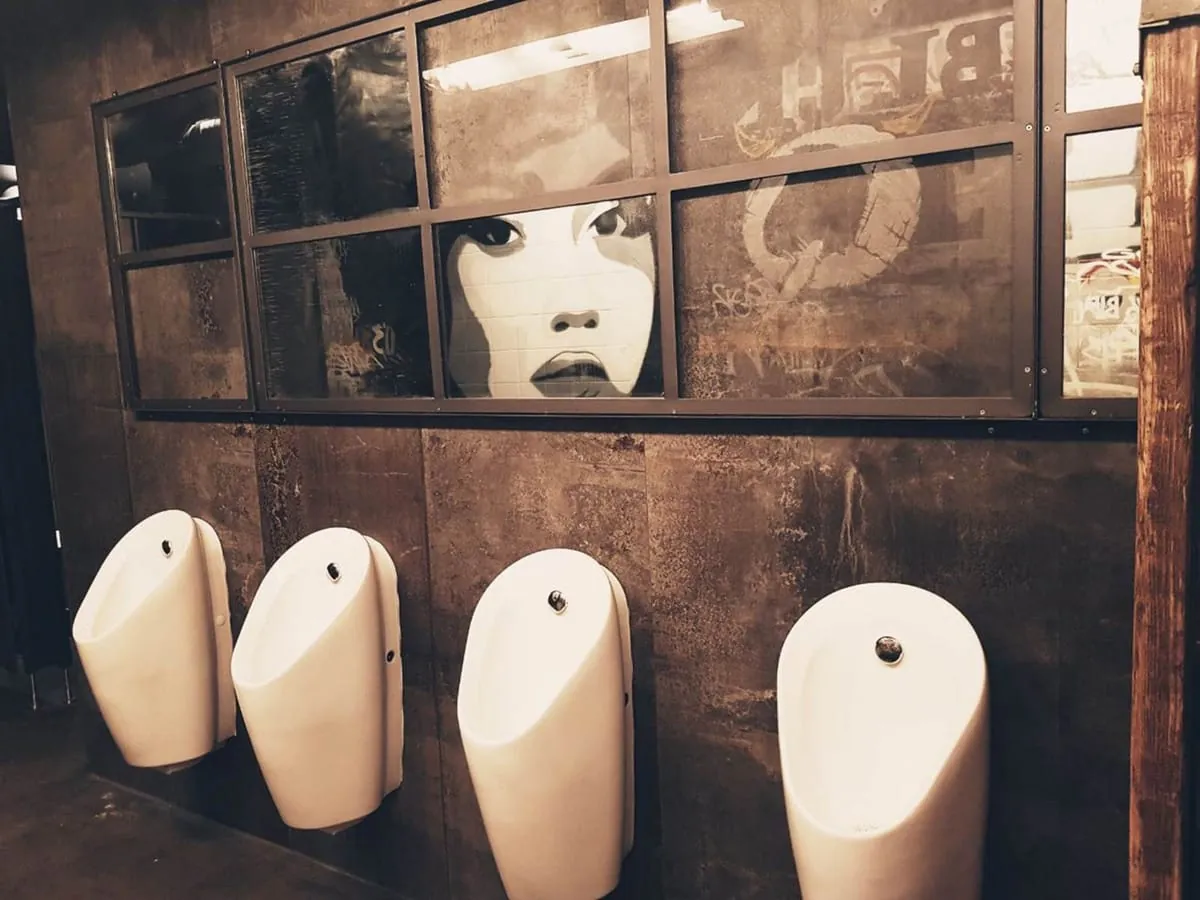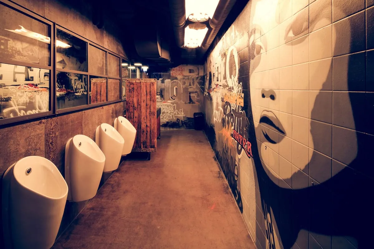 Ein dekoratives Graffiti mit Frauenkopf und wilden Schriftzügen verleiht der Herrentoilette im Steak- und Burgerrestaurant Qmuh in Ulm ein besonderes Flair.