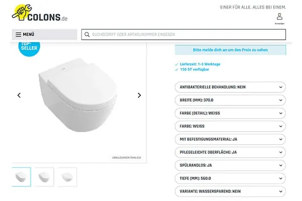 Bei mehr als 100.000 Artikeln sind bei Colons.de Variantenfilter hinterlegt. Diese ermöglichen es dem Nutzer, schnell zu einer gewünschten Variante des Hauptartikels zu gelangen. So werden auf der geöffneten Produktseite verschiedene Auswahlmöglichkeiten angegeben, z. B. für ein Wand-WC eine Variante mit oder ohne antibakterieller Beschichtung, mit oder ohne Spülrand und viele weitere Varianten. Ebenso wird bei über tausenden Produkten auf geeignete Zubehörartikel verwiesen, im Falle des Wand-WCs auf einen WC-Sitz mit Softclosing. Zudem haben viele Artikel die bekannte Funktion „das könnte Dich auch interessieren“ – hier sind sinnvolle Ergänzungsartikel zum Hauptartikel hinterlegt. Beispielsweise für das Wand-WC ein Spülkasten oder eine Betätigungsplatte für Zwei-Mengen-Spülung.
