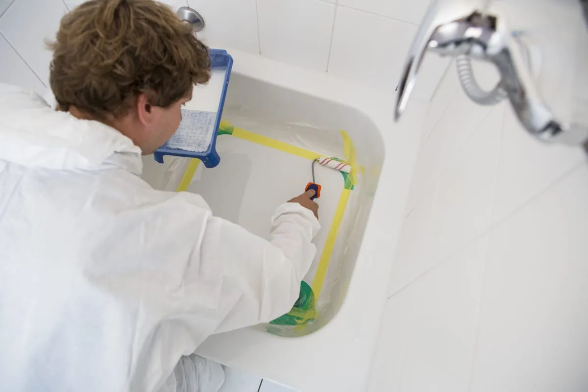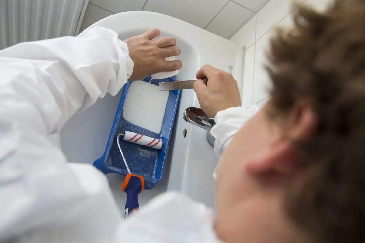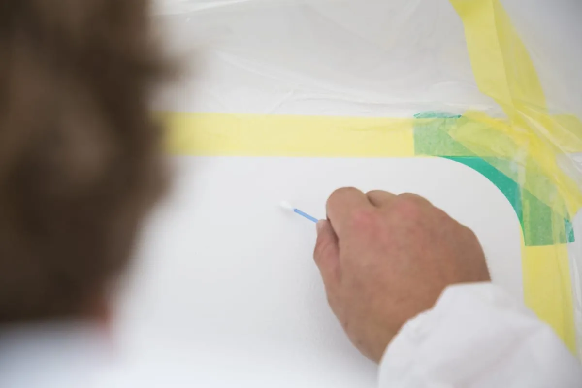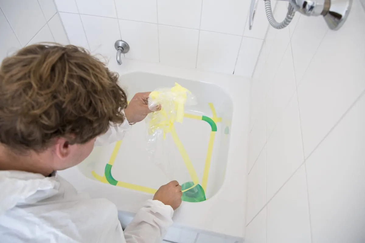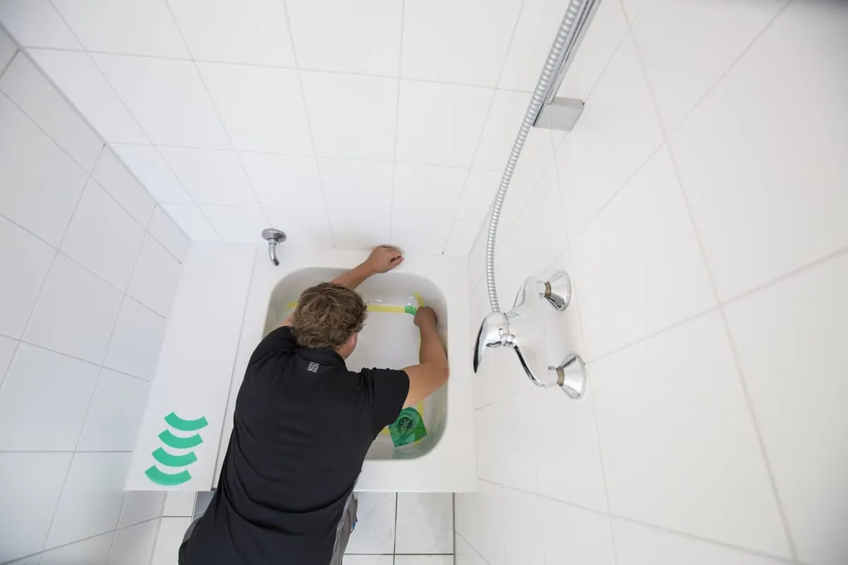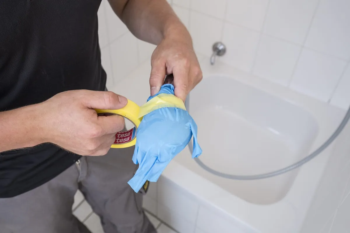 Ich reinige die Wanne oder Duschwanne mit Spiritus und einem Textil-Tuch. Das ist zwar keine explizite Vorgabe vom Hersteller, doch so kann ich Klebereste von der Verpackung oder Aufklebern gut entfernen und prüfen, ob die Oberfläche irgendwo verkratzt ist oder Farbeinschlüsse hat.“ Da die neue Oberflächenbeschichtung mit keinerlei Wasser in Berührung kommen darf, werden die Armaturen präpariert: „Ich ziehe einen Gummihandschuh über die Handbrause oder befestige eine Tüte über dem Ablauf und dichte alles mit Klebeband ab.“