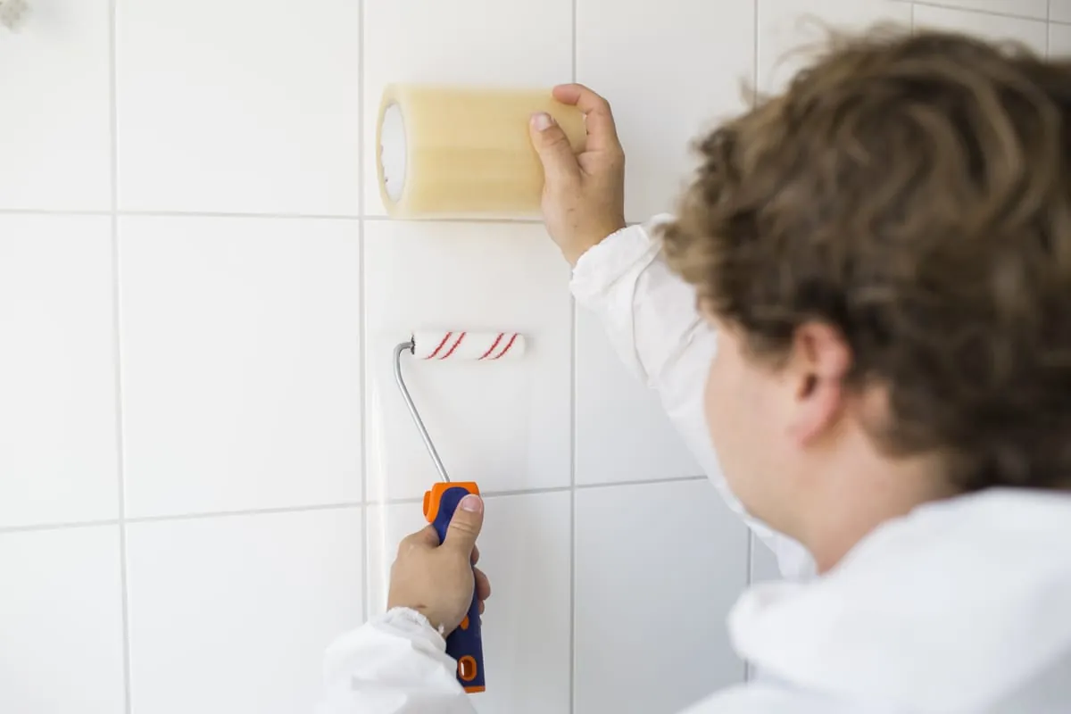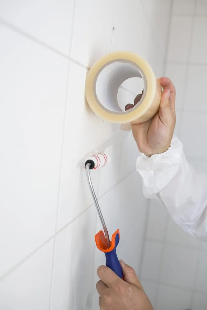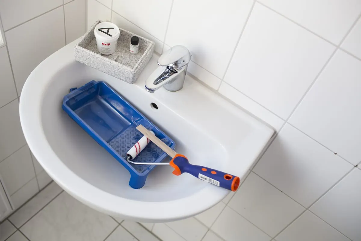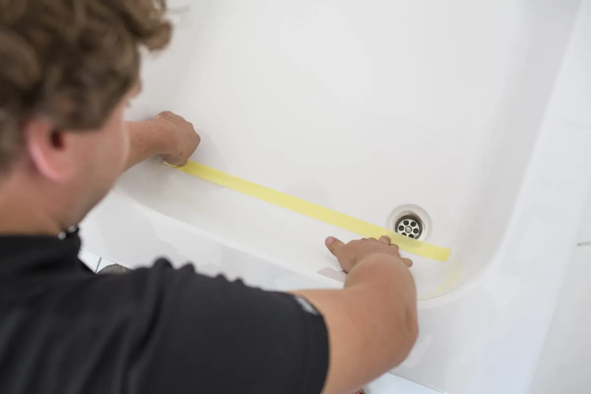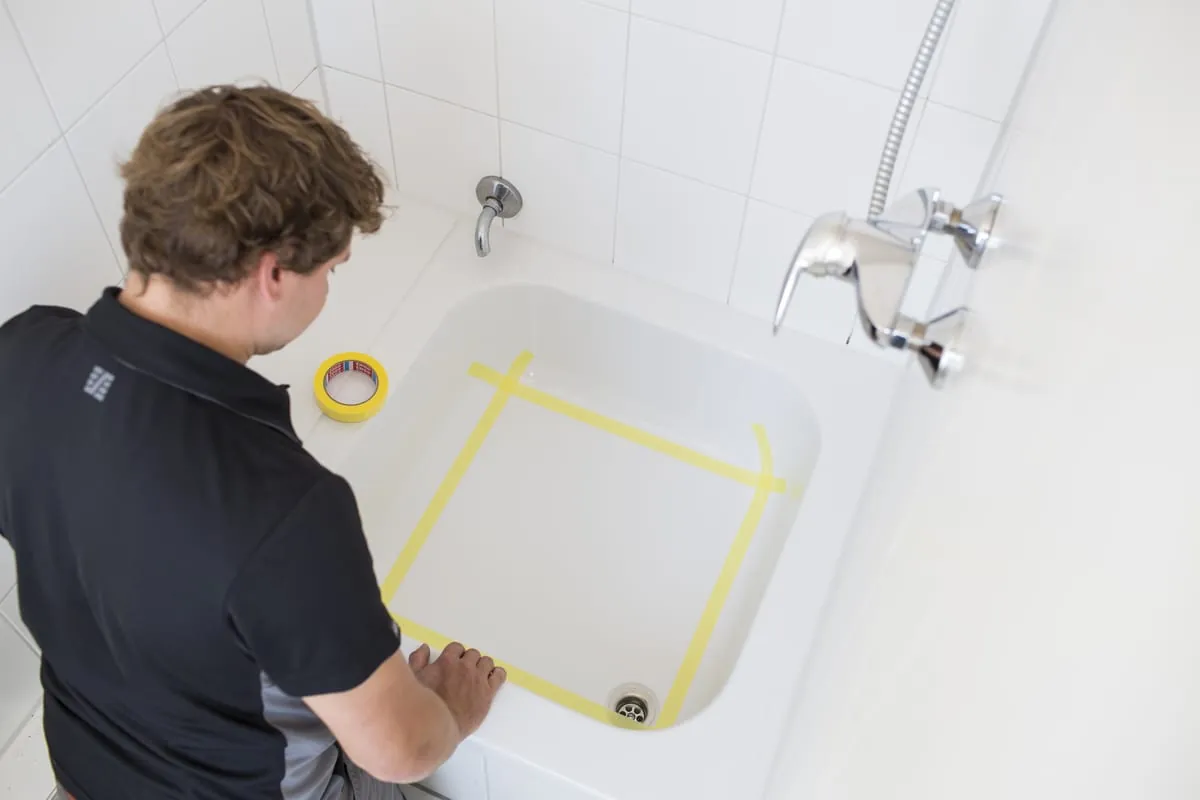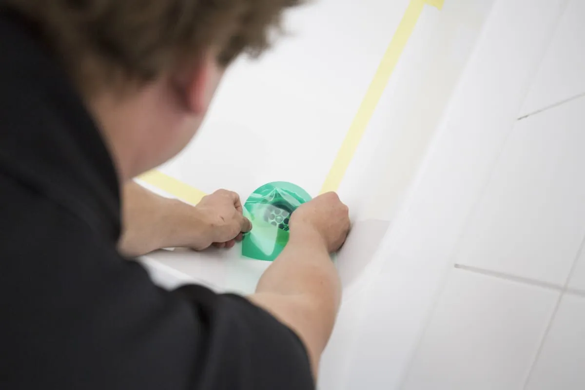 Nach der gründlichen Vorreinigung wird mit dem beiliegenden Klebeband oder einem eigenen Maler-Krepp abgeklebt. Das dient zum Schutz der Flächen, die nicht behandelt werden sollen. „Damit das Ergebnis ästhetisch wirkt, klebe ich den Ablauf separat mit einer eigenen Schablone ab. Identisches gilt in den Ecken, die später kreisförmig erscheinen sollen.“