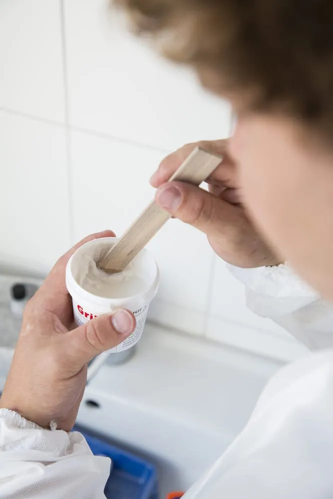 … Mit dem Holzstäbchen wird die Masse umgerührt. Je besser man aufmischt, desto leichter tut man sich beim Auftragen. Anschließend wird der Härter (Flüssigkeit B) eingeführt.