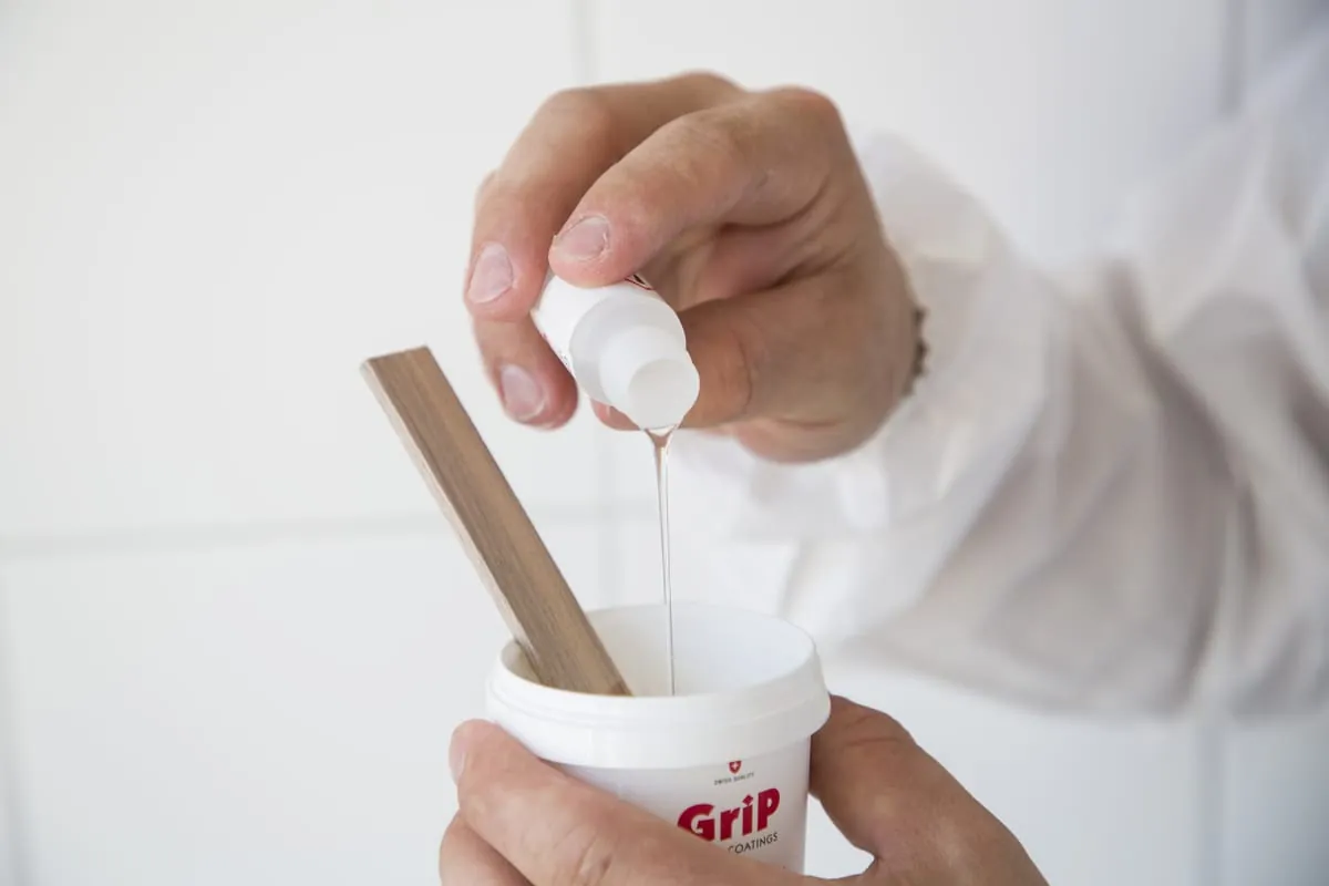 GriP AntiRutsch ist eine körnige, wasserbasierte Zwei-Komponenten Beschichtung. Nun werden die Materialien zusammen geführt. Gebinde A ist die Grip-Mischung. „Ich öffne den Becher und rühre mit dem Holzstäbchen die Masse um. Die Konsistenz fühlt sich an wie Lack mit Sandpartikeln. Je besser ich aufmische, desto leichter tue ich mich beim Auftragen.“ Anschließend wird der Härter (Flüssigkeit B) eingerührt.