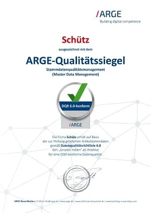 Schütz wurde mit dem neuen Arge-Qualitätssiegel ausgezeichnet. Der Raumklimaspezialist erhält den „Grünen Haken“ als Prädikat für eine DQR-konforme Datenqualität. – © Schütz GmbH & Co. KGaA