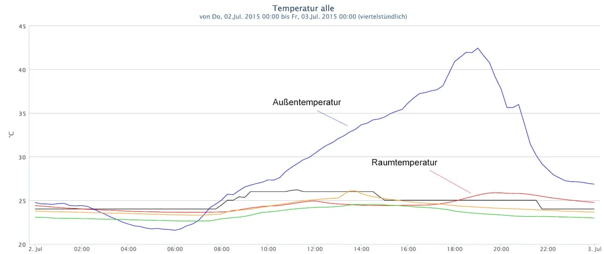 Kontinuierliche Messungen seit Juni 2015 weisen nun die Leistungsfähigkeit des Systems nach, das selbst die hohen Erwartungen des Herstellers übertreffen konnte: Im heißen Sommer 2015 kam es zu Schwankungen der Außentemperatur zwischen +7°C bis zu +42°C an der Gebäudefassade. Die Raumtemperaturen in vier verschiedenen Büroräumen an unterschiedlichen Gebäudestellen blieben jedoch über den gesamten Beobachtungszeitraum äußerst ausgeglichen und lagen stets zwischen +22°C und +26°C. Selbst am heißesten Tag, dem 2. Juli mit einer Außentemperatur am Gebäude von +42°C am späten Nachmittag erreichte keine Messstelle mehr als +26°C.