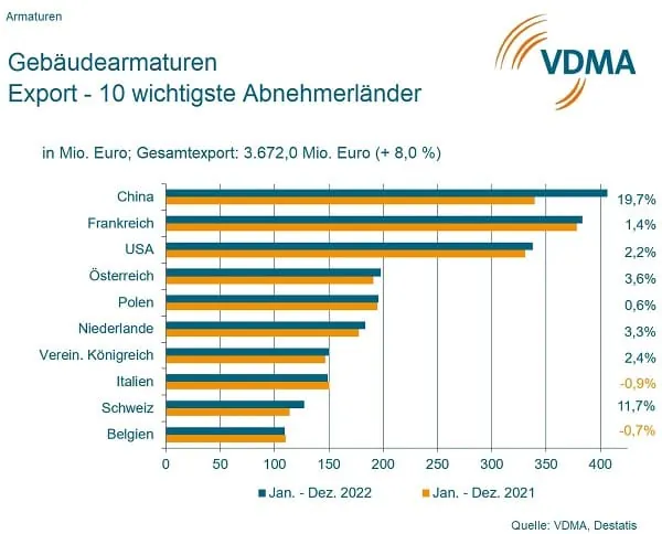 Im internationalen Wettbewerb konnten sich die deutschen Hersteller von Gebäudearmaturen 2022 gut behaupten. Das Exportgeschäft, das sich bereits 2021 rasch vom Corona-bedingten Rückgang erholt hatte, konnte 2022 weiter expandieren. Der deutsche Export von Gebäudearmaturen stieg um 8 % auf insgesamt 3,7 Milliarden Euro. Die Liste der Top-10-Absatzländer wurde – anders als in den Vorjahren – von China angeführt.