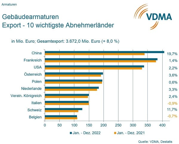Im internationalen Wettbewerb konnten sich die deutschen Hersteller von Gebäudearmaturen 2022 gut behaupten. Das Exportgeschäft, das sich bereits 2021 rasch vom Corona-bedingten Rückgang erholt hatte, konnte 2022 weiter expandieren. Der deutsche Export von Gebäudearmaturen stieg um 8 % auf insgesamt 3,7 Milliarden Euro. Die Liste der Top-10-Absatzländer wurde – anders als in den Vorjahren – von China angeführt.