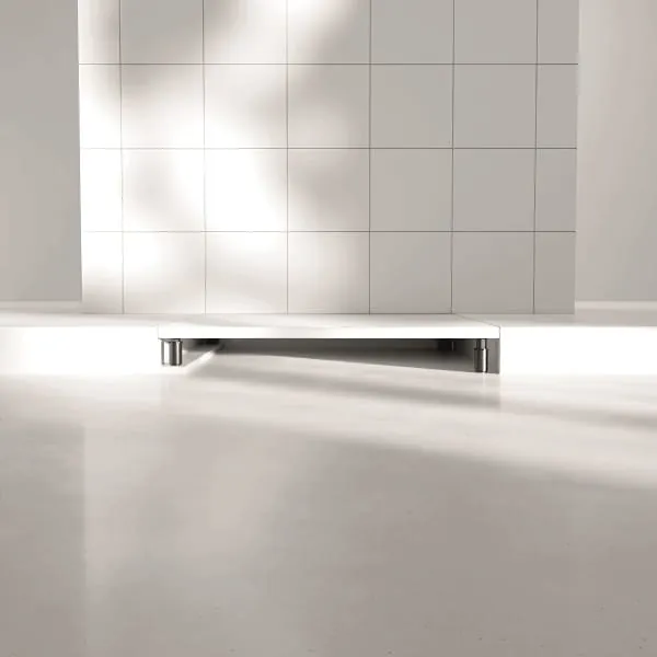 Das Funktionsprinzip von BetteLevel ist eine selbstarretierende Rastung im Systemfuß – auf den halben Millimeter genau. Die mit den Füßen verklebte Duschfläche wird am Montageort aufgestellt und vom Monteur zwischen 80 und 200 mm auf die spätere Fußbodenebene angehoben; idealerweise – aber nicht zwingend – mittels Saughebern.