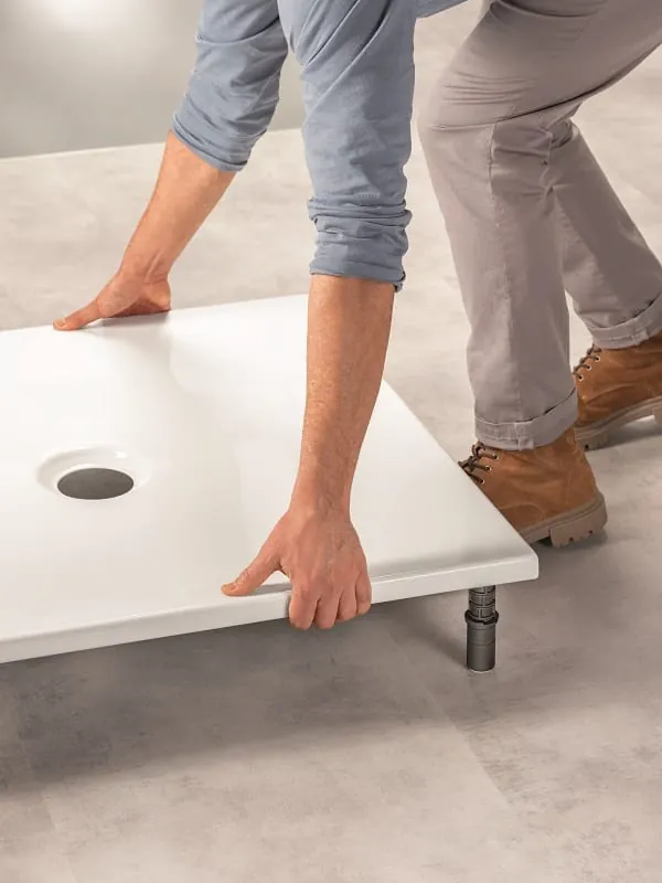Mit den universell einsetzbaren Systemfüßen hat ein Montagetrupp in jedem Fall das richtige Material für den Duschflächeneinbau dabei. Dank ihrer universellen Einsetzbarkeit erleichtern die Systemfüße außerdem die Lagerhaltung in Großhandel und Handwerk. Die werkzeuglos zu verarbeitenden Kunststoffzylinder ersetzen hier Aluminiumprofile sowie weitere Montageteile.