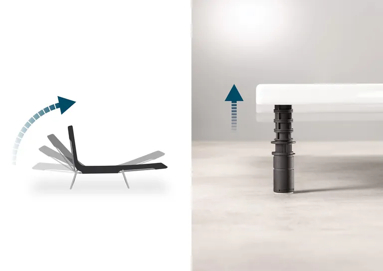 Das System wurde zusammen mit dem Bette-Handwerkerbeirat entwickelt – die Spezialistinnen und Spezialisten aus der Praxis hatten Gelegenheit, Prototypen der Teleskopfüße zu erproben und Detailverbesserungen anzuregen.
