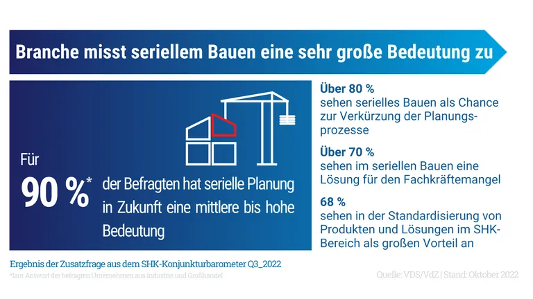 Bei der Befragung zum seriellen Bauen wurde zwischen serieller Planung und serieller Ausführung unterschieden. Serielles Bauen umfasst beispielsweise standardisierte Grundrisse und Typenhäuser. Unter serieller Ausführung wird die Vorfertigung von Wand- und Deckenelementen oder Raummodulen bzw. Badmodulen begriffen. Eingebettet ist die Zusatzfrage zum seriellen Bauen in die Erhebung der SHK-Konjunkturdaten des 3. Quartals.