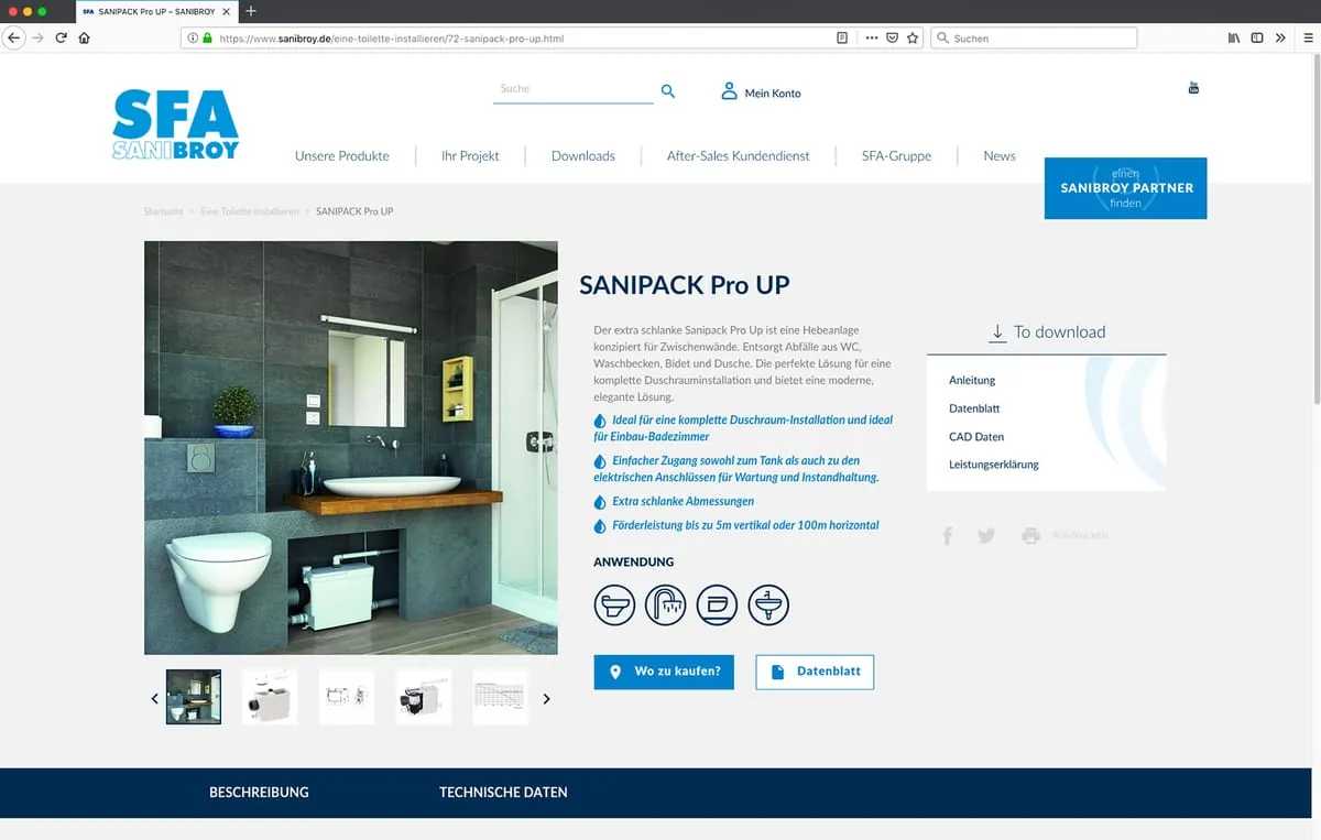 Die französische SFA Gruppe hatte sich einen länderübergreifenden einheitlichen Auftritt zum Ziel gesetzt und diese Aufgabe erfolgreich gelöst. Seit Anfang November 2018 ist nun auch in Deutschland die neue SFA Sanibroy Website online.