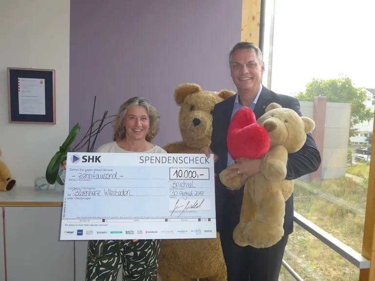 SHK Vorstand Sven Mischel überreichte in Wiesbaden am 30. August den Spendenscheck über 10.000 Euro an Diana Stein von der Bärenherz Stiftung. Er sagte: „Der Besuch im Kinderhospiz Bärenherz in Wiesbaden hat mich tief berührt. Die Arbeit, die hier von Mitarbeitern und Ehrenamtlichen geleistet wird, kann gar nicht hoch genug eingeschätzt werden. Jeder Cent unserer Spende ist hier gut angelegt.“