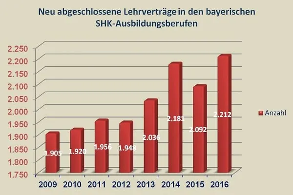 Zum 1. September 2016 wurden in den Ausbildungsberufen Anlagenmechaniker SHK, Spengler, Ofen- und Luftheizungsbauer, sowie Behälter- und Apparatebauer 2.212 neue Lehrverträge abgeschlossen. Das ist der höchste Stand seit 15 Jahren. Insgesamt haben sich zum Stichtag 6.500 Lehrlinge in Ausbildung befunden.