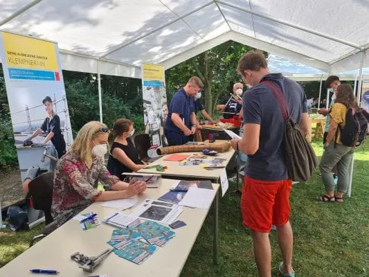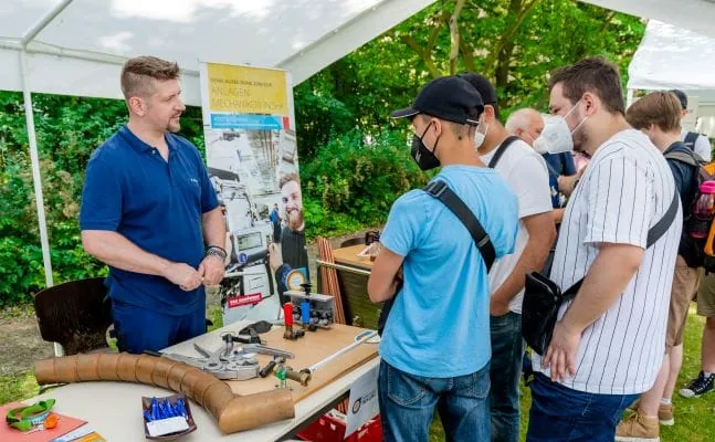 210 Schülerinnen und Schüler der Jahrgangsstufe 9-10 hatten sich mit ihren Lehrerinnen und Lehrern angemeldet, in das SHK-Kompetenzzentrum der Innung zu kommen. Auf dem großen Außengelände war es möglich, unter Einhaltung aller Hygiene- und Sicherheitsvorschriften über duale Ausbildungsberufe zu informieren. „Es ist den jungen Leuten anzumerken, wie dankbar sie für diese Möglichkeit sind“, beobachtete Geschäftsführer Andreas Koch-Martin das Treiben auf dem Hof. „Endlich einmal wieder eine Begegnung, ein haptisches Erleben. Das ist etwas anderes, als alleine vor dem Tablet zu sitzen“. Der Schwerpunkt lag auf der Präsentation von Umweltberufen, die jungen Menschen mit klimapolitischen oder technischen Interessen eine krisensichere Perspektive geben. Die Berufe des Sanitär- und Heizungshandwerks, der Baubranche, des Elektrohandwerks, Malerhandwerks, Metallbaus und des Kraftfahrzeughandwerks stehen alle für Fachwissen, das unverzichtbar ist für die Energiewende, die Mobilitätswende, die vernetzte Gebäude- und Automatisierungstechnik, Dämmung der Gebäudehülle und Nachhaltigkeit.