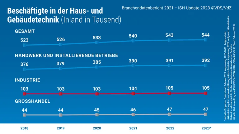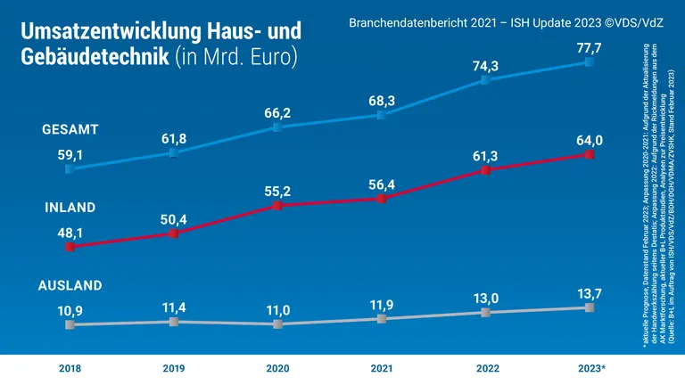 Die Beschäftigtenzahl im gesamten Wirtschaftsbereich Haus- und Gebäudetechnik lag 2022 bei 543.000. Damit hat sich die Beschäftigtenzahl erneut erhöht, während sich die Unternehmensanzahl leicht rückläufig entwickelte. Die weltweiten Umsätze im Gesamtmarkt der Haus- und Gebäudetechnik beliefen sich 2022 auf 74,3 Mrd. Euro (Inland: 61,3; Ausland: 13 Mrd. Euro). Der Megatrend Klimaschutz und die Nachfrage nach komplexer Gebäudetechnik beflügeln den Wirtschaftsbereich.