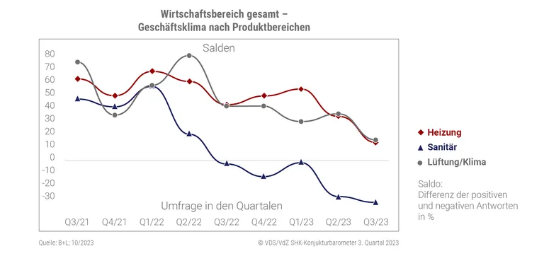 Im Vergleich zum 3. Quartal 2021 ist das aktuelle Geschäftsklima im SHK-Konjunkturbarometer 3. Quartal 2023 um 56 Punkte gefallen.