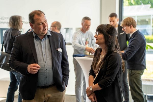 Hausherr Axel Stoiber (l.), Geschäftsführer der Hüppe Deutschland GmbH, freute sich über viele Gäste, die die Eröffnung des neuen Standorts unweit von München und Augsburg zusammen mit dem Duschplatzspezialisten aus dem Hohen Norden feierten. – © Timeless Media/Hüppe GmbH