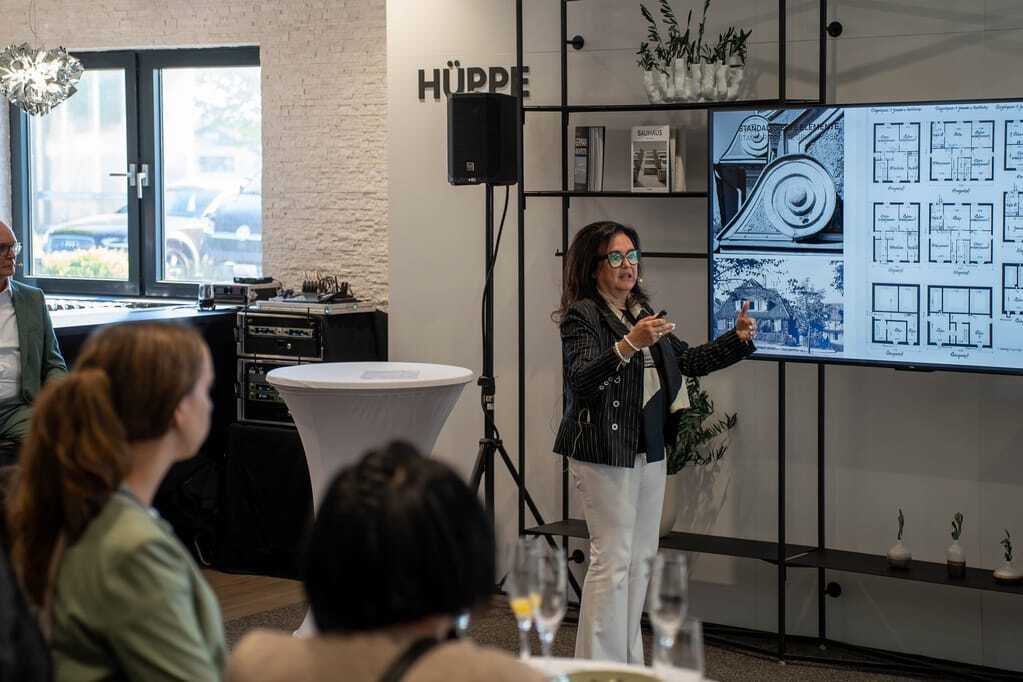 „No Joy in Repetition“: Hüppe warf gemeinsam mit Nicole Franken, Gesellschafterin und Mitglied der Geschäftsleitung der Franken Generalplaner aus Frankfurt am Main, und den Gästen des Eröffnungsevents einen Blick in die Zukunft der Architektur des Wohnens. – © Timeless Media/Hüppe GmbH