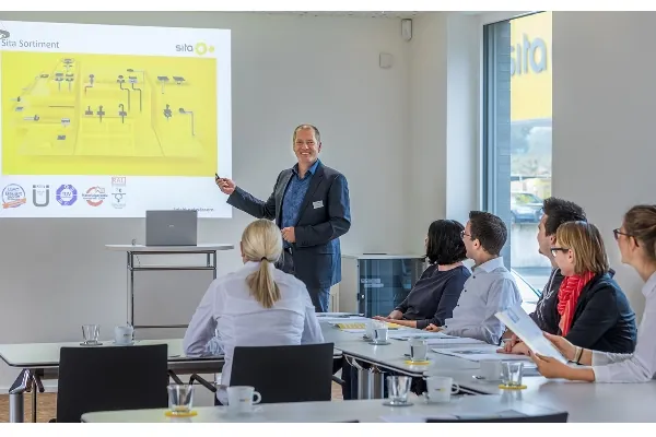 Die Erwartungen der Teilnehmer werden zu Beginn jedes Seminars abgefragt und in das Programm eingebaut. Nach der Basisinformation durch Entwässerungsexperten splitten sich die Seminare in die speziellen Themenmodule. „Learning by doing“. Dieser Erkenntnis folgt der Praxisteil. „Wir wollen uns zusammen auch die Hände schmutzig machen“, so Dipl.-Ing. Ute Weiß, Projektleiterin Flachdachentwässerung, und eine der Referentinnen. Der praktische Teil, z. B. beim Produktionsrundgang, am Gully-Versuchsbecken oder im Sita Showroom, lädt dazu ein, Entwässerungstechnik im wahrsten Sinne des Wortes zu „erfassen“. In lockerer Atmosphäre entstehen hier Dialoge, die Fachwissen mit Praxisbezug erden. Wer spezielle Fragen mitbringt, nimmt garantiert individuelle Antworten mit, die ihm die tägliche Arbeit erleichtern.