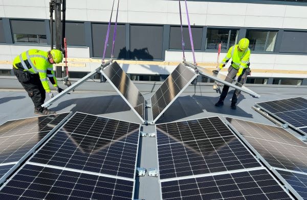Faltbare PV-Anlage: Die SmartSolarBox wird auf dem Flachdach auseinandergeklappt und anschließend mit den bereits platzierten Systemen verbunden. – © Sun-Net Norge AS/Smartvolt AG
