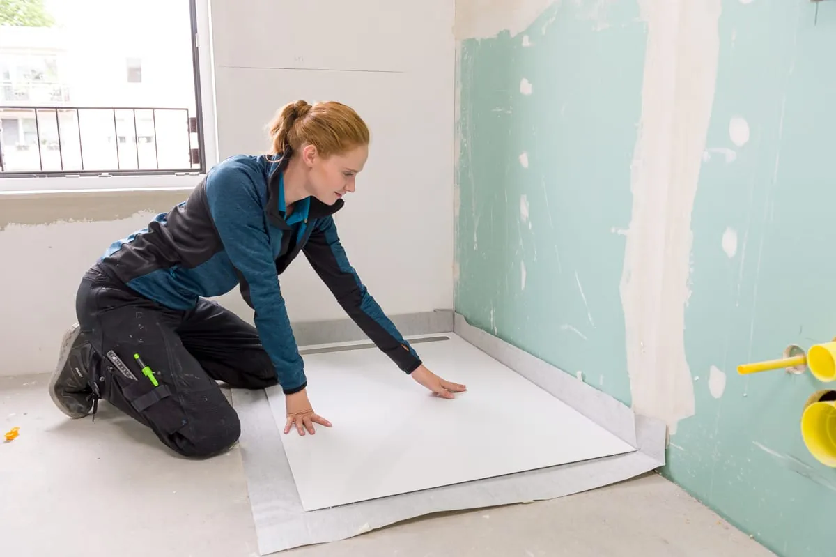 Als nächstes wird der Träger samt Duschfläche und den werksseitig vormontierten Abdichtbändern in der Aussparung fixiert und die Duschrinne mit dem abgelängten Ablauf verbunden. Für einen optimalen Schallschutz sorgt das mitgelieferte Schallschutzband am Gefälleträger. Die flexiblen Abdichtbänder lassen sich einfach und sicher in die Verbundabdichtung des Badezimmers integrieren. Danach kann der Fliesenleger das Bad verfliesen.