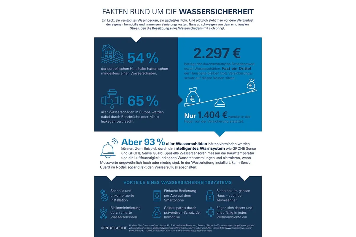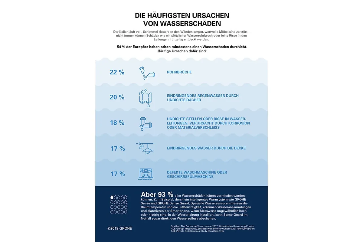 Der Bau des eigenen Hauses oder der Kauf der Traumwohnung gehört zu den aufregendsten Meilensteinen im Leben. Da ist es verständlich, dass Immobilienbesitzer ihr Heim bestmöglich vor drohenden Risiken oder Schäden schützen möchten. So sind Brand- und Einbruchschutz für das Eigenheim schon lange selbstverständlich und teilweise sogar verpflichtend. Wasserschutz hingegen wird von vielen jedoch noch vernachlässigt. Nur knapp 44 % der Europäer vermuten, dass ein Wasserschaden verheerende Folgen haben könnte. Obwohl es in 54 % der Haushalte schon mindestens einmal zu Wasserschäden im Trinkwassersystem gekommen ist, zeigt sich dafür in der Bevölkerung ein relativ geringes Bewusstsein. Dies belegt „The ConsumerView“, eine quantitative Bewertung Europas, aus dem Jahr 2017. Ein Leck, ein verstopftes Waschbecken oder ein geplatztes Rohr können schnell zu immensen Sanierungskosten im neuen Heim führen. Laut Zahlen der Deutschen Versicherung belaufen sich in Europa die Reparaturkosten infolge von Wasserschäden auf durchschnittlich 2.297 Euro – das sind ähnliche finanzielle Ausmaße wie bei Feuer- oder Einbruchschäden. Hinzukommen die gesundheitlichen Risiken: Aufgrund der entstehenden Feuchtigkeit kann sich innerhalb von nur 24 Stunden Schimmel bilden, der u. a. Atemwegsbeschwerden, Asthma und Allergien auslösen kann, teilt die WHO mit. Sind Alarmanlagen und Feuermelder in den meisten Eigenheimen inzwischen Standard, gehören Wassersicherheitssysteme bei einer Vielzahl von Haushalten noch nicht zum Repertoire. Aber: Der Großteil der Schäden hätten durch entsprechende Schutzsysteme wie Grohe Sense und Grohe Sense Guard verhindert werden können.