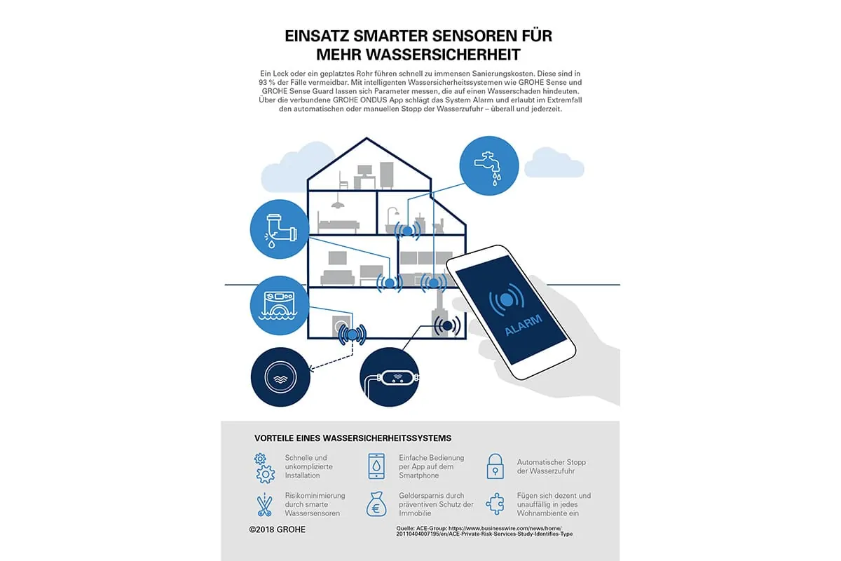 Das intelligente Grohe Sense System überwacht Feuchtigkeit, erkennt Wasserlecks, warnt die Bewohner unverzüglich und unterbricht automatisch die Wasserzufuhr. Der Wassersensor wird auf dem Fußboden platziert. Sollte die Unterseite des Sensors beispielsweise wegen eines Lecks mit Wasser in Kontakt kommen, gibt Grohe Sense eine Warnmeldung ab. Der Sensor misst zudem die Raumtemperatur sowie Luftfeuchtigkeit und informiert den Verwender bei Abweichungen vom Normwert. So sind Eigenheimbesitzer auch vor Frost- und Schimmelrisiken optimal geschützt. An der Hauptwasserleitung eines Hauses professionell angebracht, funktioniert Grohe Sense Guard als ein smartes Kontrollgerät. Es misst die Systemtemperatur zur Indikation von Frostgefahr oder entdeckt Leckagen und stoppt die Wasserzufuhr automatisch. Regelmäßige Mikroleckage-Tests, die einmal alle 24 Stunden durchgeführt werden, spüren auch Tropfenaustritte in der Kaltwasserleitung auf. Das innovative Grohe Sense Wassersicherheitssystem basiert auf WLAN-Technologie gemäß Industriestandard und wird über die Grohe Ondus App gesteuert. Diese App bildet das Herzstück. Sie bietet höchste Sicherheit und gewährt, dass Grohe Sense und Grohe Sense Guard überall und zu jeder Zeit überwacht und gesteuert werden können.