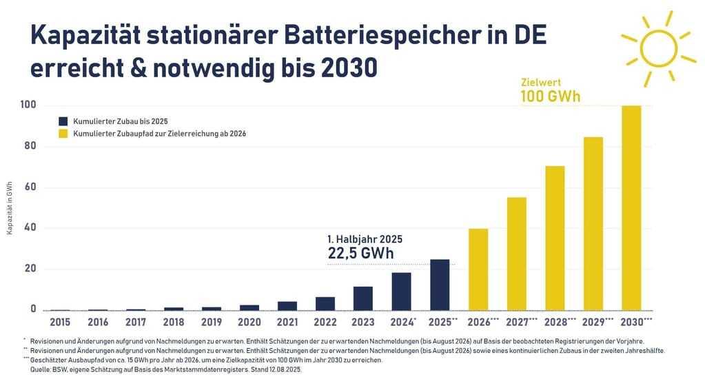 Hochrechnungen des BSW-Solar auf Basis von Daten der Bundesnetzagentur haben ergeben, dass in Deutschland Ende Juli 2025 rund 2,2 Mio. stationäre Batteriespeicher mit einer Speicherkapazität von insgesamt rund 23 GWh in Betrieb waren.