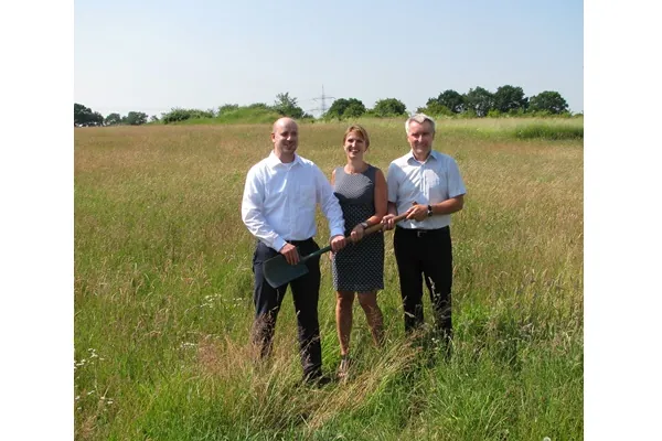 Spatenstich für das erste „Zentrum für mobile Wärme“ (v.l.n.r.): Martin Reuland, Leiter Vertrieb, Britta Kaets, Geschäftsführerin, und Martin Hecker, Geschäftsführer, heizkurier GmbH. – © heizkurier GmbH