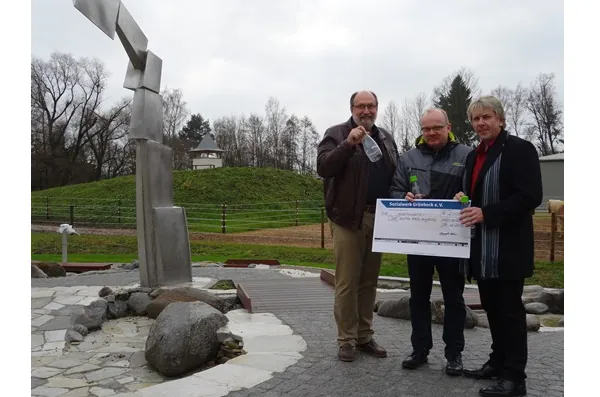 Eine Spende für den neuen Therapie-Brunnen im „Ziegelhof“ des Bunten Kreises überreichten Achim Maneth und Norbert Körber vom Sozialwerk Grünbeck e.V. an Horst Erhardt vom Bunten Kreis (links im Bild). – © Grünbeck
