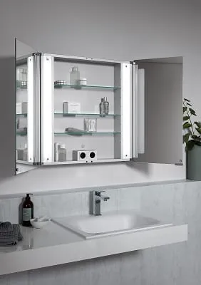 Das Alu-Spiegelschrank-Sortiment von HSK Duschkabinenbau wartet mit vielen Funktionen auf. So lassen sich die edlen Doppelspiegeldrehtüren mit Hilfe eines Scharniers extra weit öffnen. Damit garantieren diese eine perfekte Rundumsicht. Dahinter liegend verbirgt sich großzügiger Stauraum für Badutensilien, die auf drei höhenverstellbaren Glasböden Platz finden. Es gibt eine Doppelsteckdose zum Anschluss von Elektrogeräten. Die Anordnung der Lampen lässt das Licht gleichmäßig auf das Gesicht strahlen. Die Leuchtmittel befinden sich bei den Varianten ASP Softcube LED und ASP 500 LED hinter sandgestrahltem Glas. Damit wirkt das Licht sanft und blendfrei. Der ASP 300 LED ist mit einer zeitlos eleganten LED-Kompaktleuchte ausgestattet. Diese befindet sich oberhalb des Spiegelschrankes. Er überzeugt mit geringem Stromverbrauch, langer Lebensdauer und hellem, aber blendfreiem Licht. In der dreitürigen Variante befinden sich zwei LED-Leuchten am Spiegelschrank.